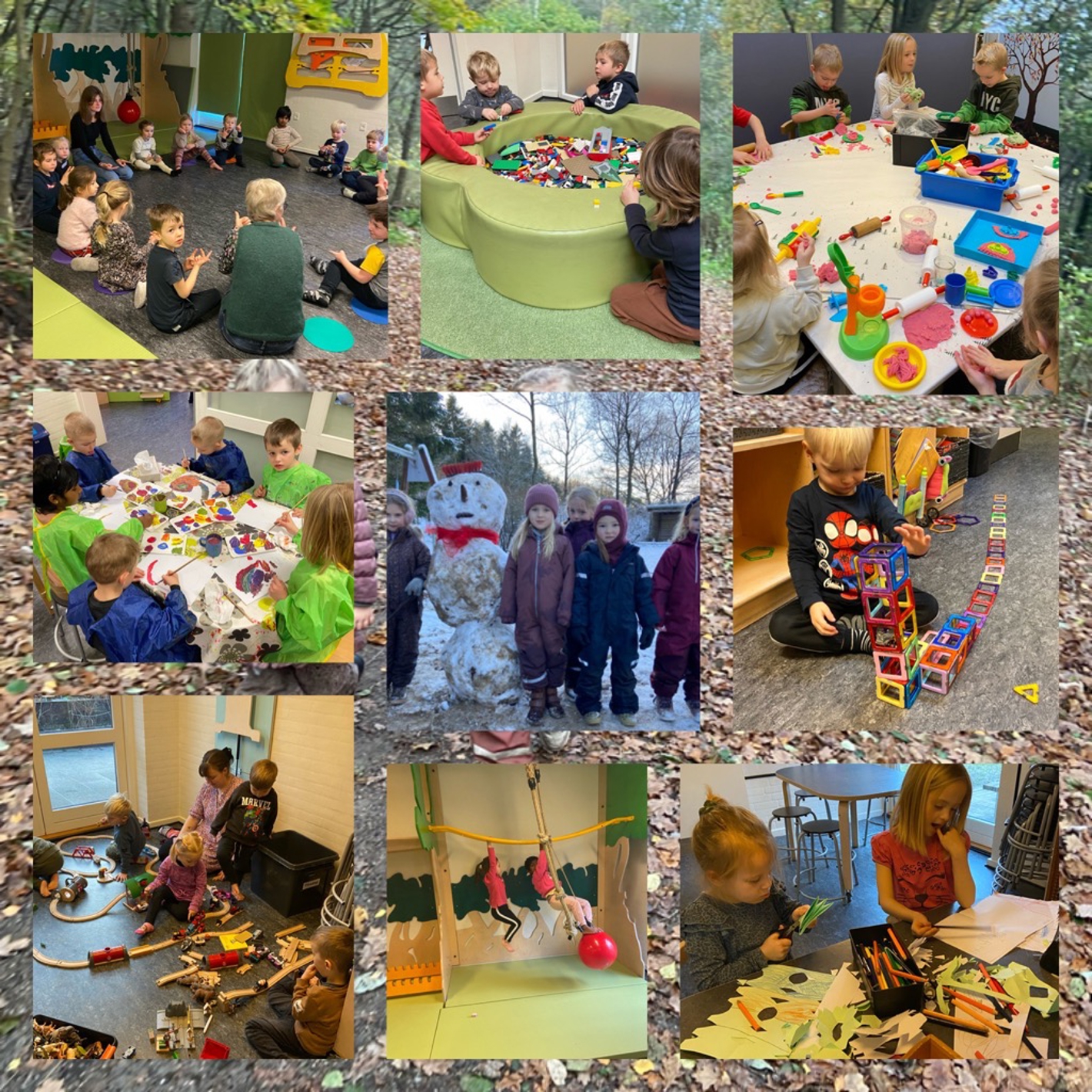 Vi leger ude og inde. Vi bruger vores skønne og store legeplads. Vi går tur i vores nærområde, på stierne, langs åen, på heden, rideskolen, anlægget og besøger de forskellige legepladser tæt på.
